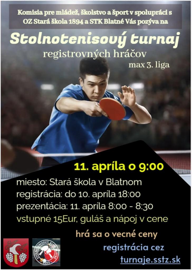 Komisia pre mládež, školstvo a šport v spolupráci s OZ Stará škola 1894 a STK Blatné Vás pozýva na Stolnotenisový turnaj registrovaných hráčov, ktorý sa uskutoční 11.apríla 2026 o 9:00 v Starej škole v Blatnom.